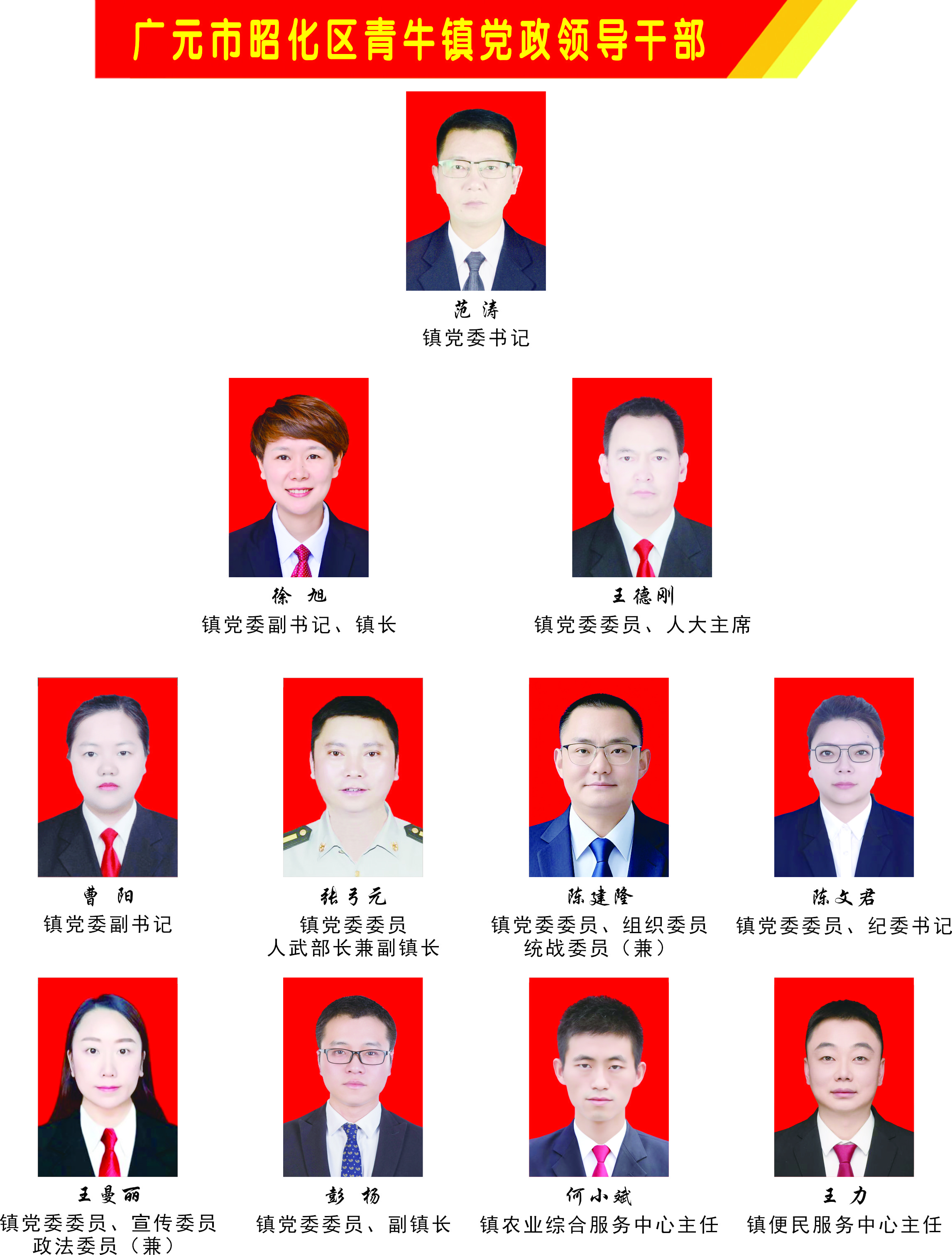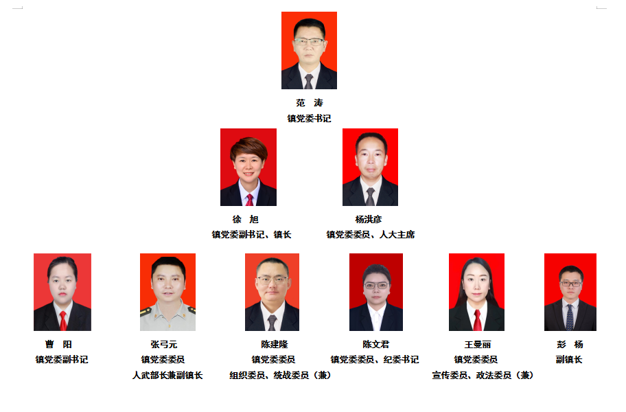 张弓元 镇党委委员、人武部长兼副镇长 分工负责人民武装、国防动员、退役军人事务、应急管理、安全生产、防灾减灾、森林防灭火、防汛抗旱、消防、质量安全、市场监管、亭子湖管理(含水上安全)等工作,以及分工领域党的建设、行政执法;分管镇应急管理办公室。对接区人武部、区退役军人局、区应急局、区市场监管局、区亭子湖景区保护与发展中心、区国防动员事务中心等单位。联系负责白牛村。