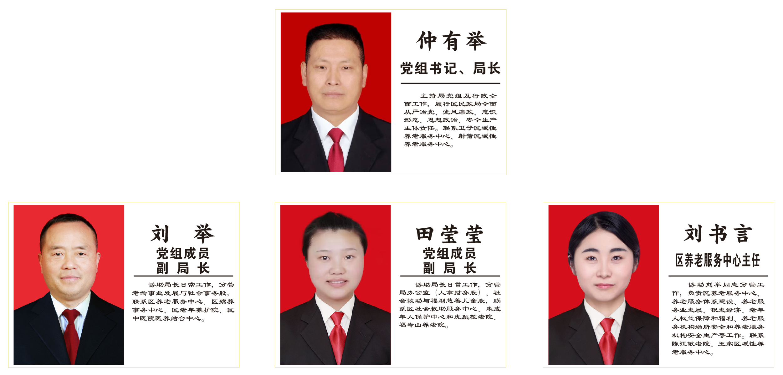 仲有举:局党组书记、局长。主持局党组及行政全面工作,履行区民政局全面从严治党、党风廉政、意识形态、思想政治、安全生产主体责任。联系卫子区域性养老服务中心、射箭区域性养老服务中心。