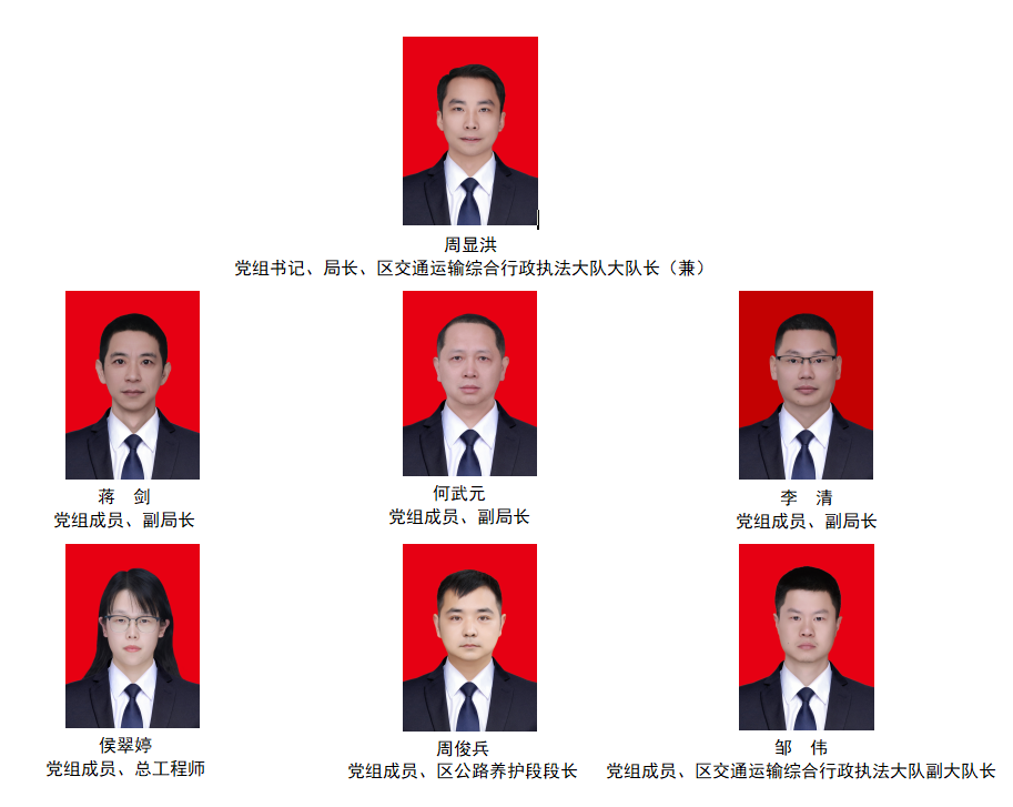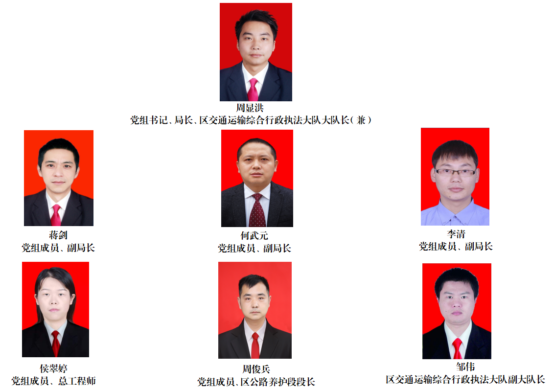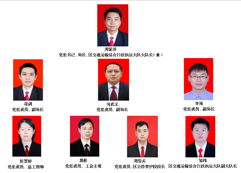 周显洪 党组书记、局长、区交通运输综合行政执法大队大队长(兼):主持全面工作。负责内部审计工作。