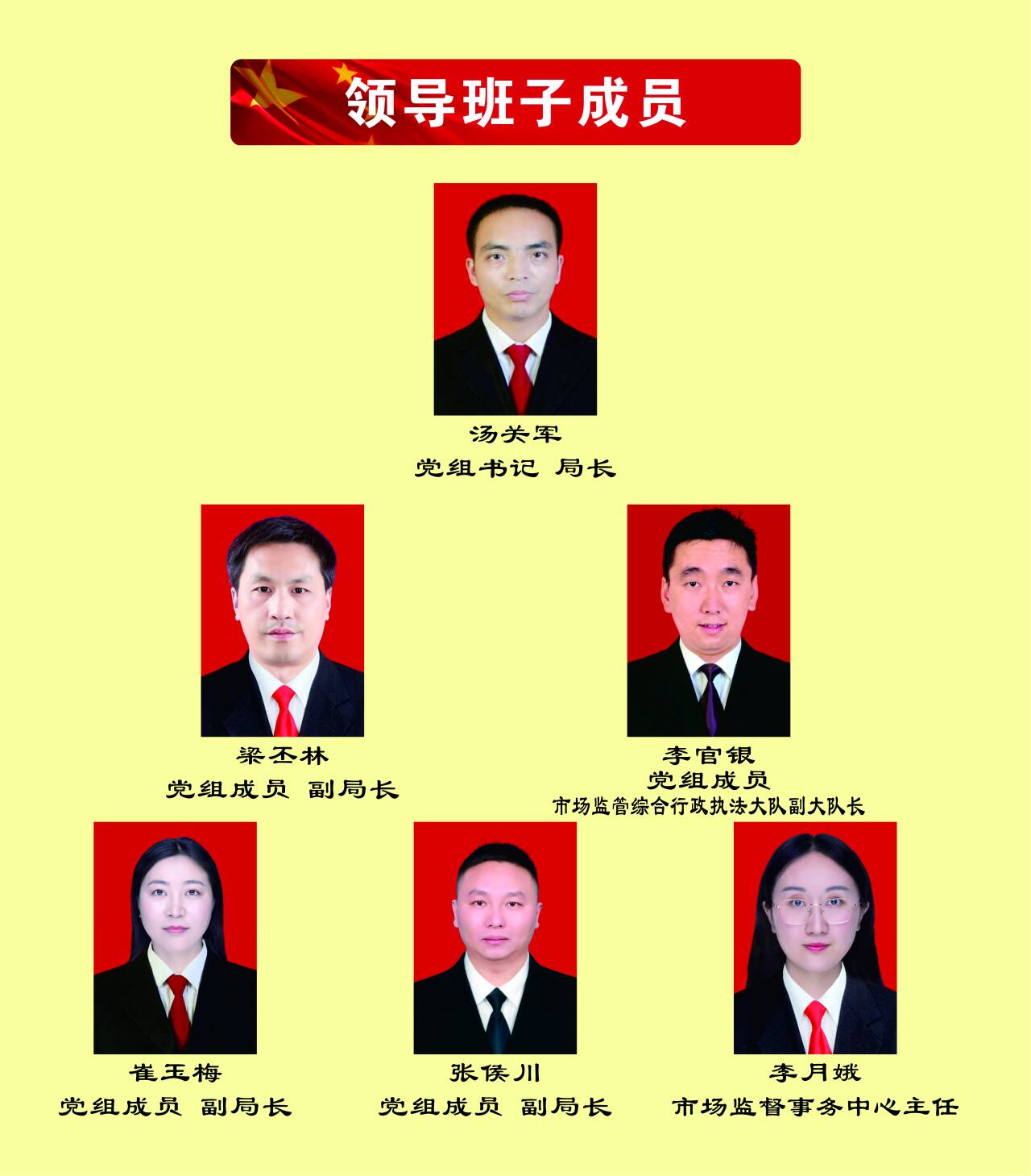 汤关军:党组书记、局长、市场监督综合行政执法大队大队长。主持全面工作。