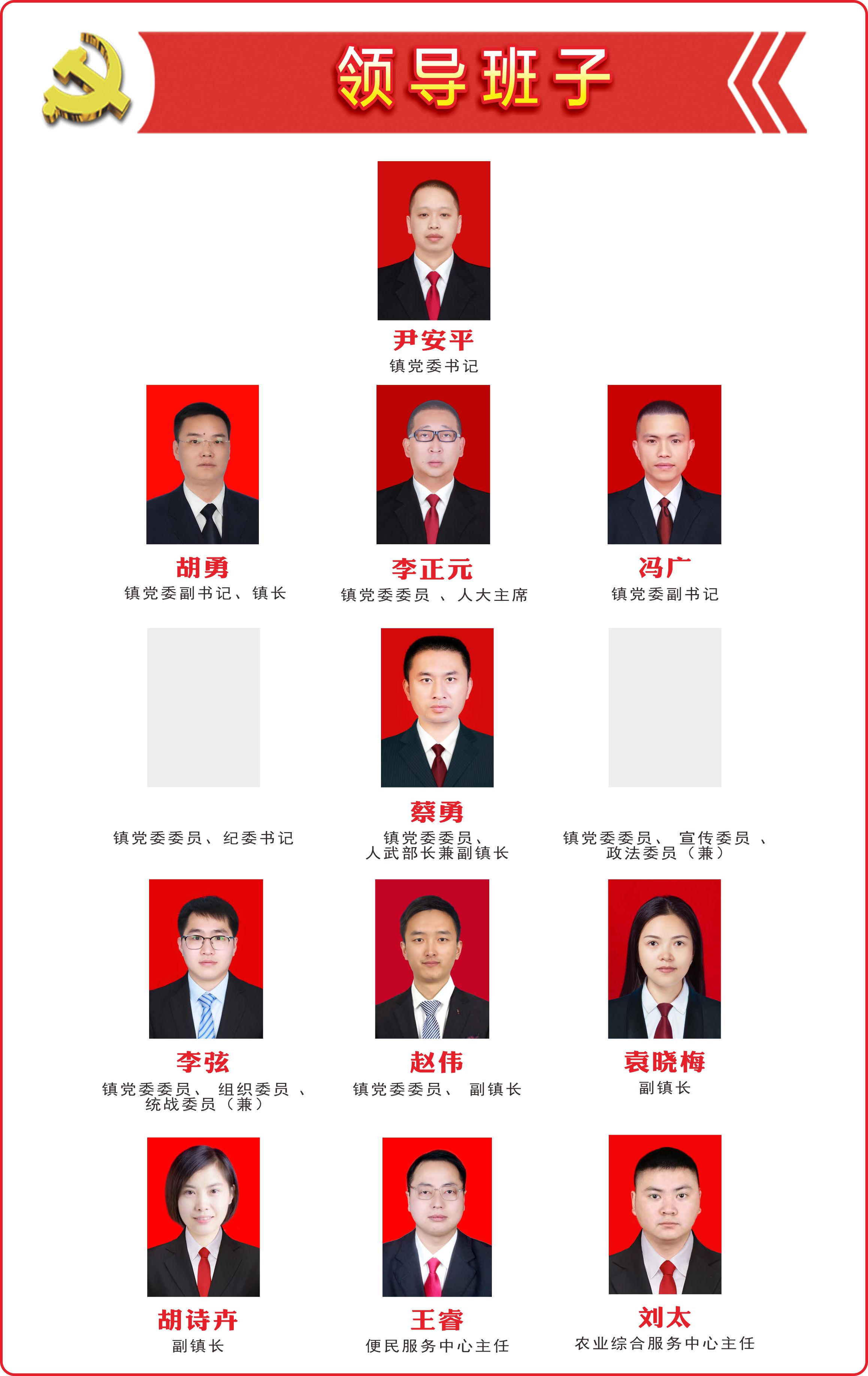 胡诗卉 镇政府副镇长、妇联主席、团委书记。负责民政、残联、统计、城乡环境综合治理、环境保护、文化广播电视体育和旅游、团委、妇女儿童、工商联、科协、红十字会等工作。分管社会事务和社会治理办公室(民政工作)、经济发展办公室(生态环境保护办公室)、乡村建设和文化旅游服务中心(文化旅游体育等工作)。