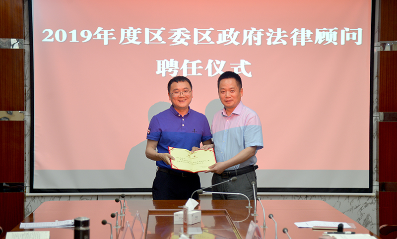 为全面贯彻落实《法治政府建设实施纲要(2015-2020年》要求,不断提高政府依法决策水平,推进法治政府建设,6月17日,2019年区委区政府新一届法律顾问聘任仪式在区广电中心举行,区委常委、常务副区长刘强出席聘任仪式并为聘任的五位法律顾问颁发了聘书。