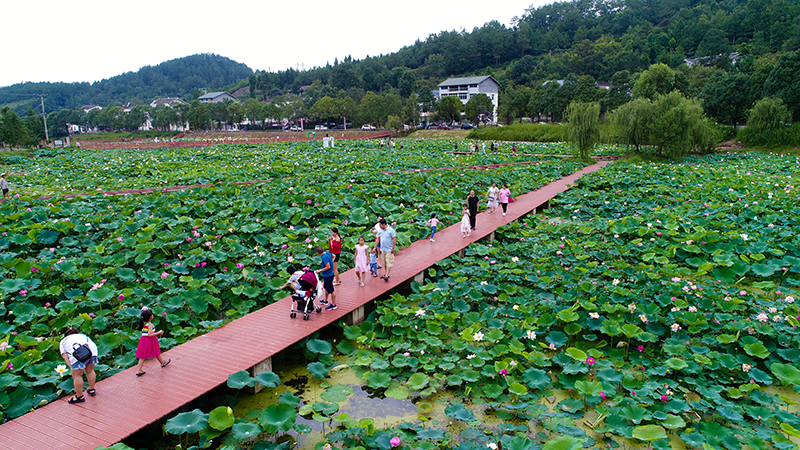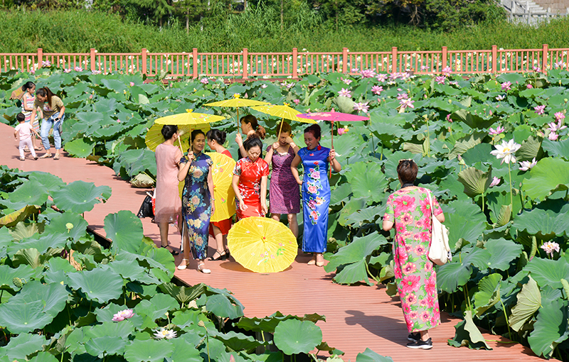 漫步在荷塘的栈道上,荷香袅袅。朵朵荷花,姿态各异,或含苞待放,或亭亭玉立,或迎风盛开。游客们纷纷拿出手机,记录下眼前的美景。