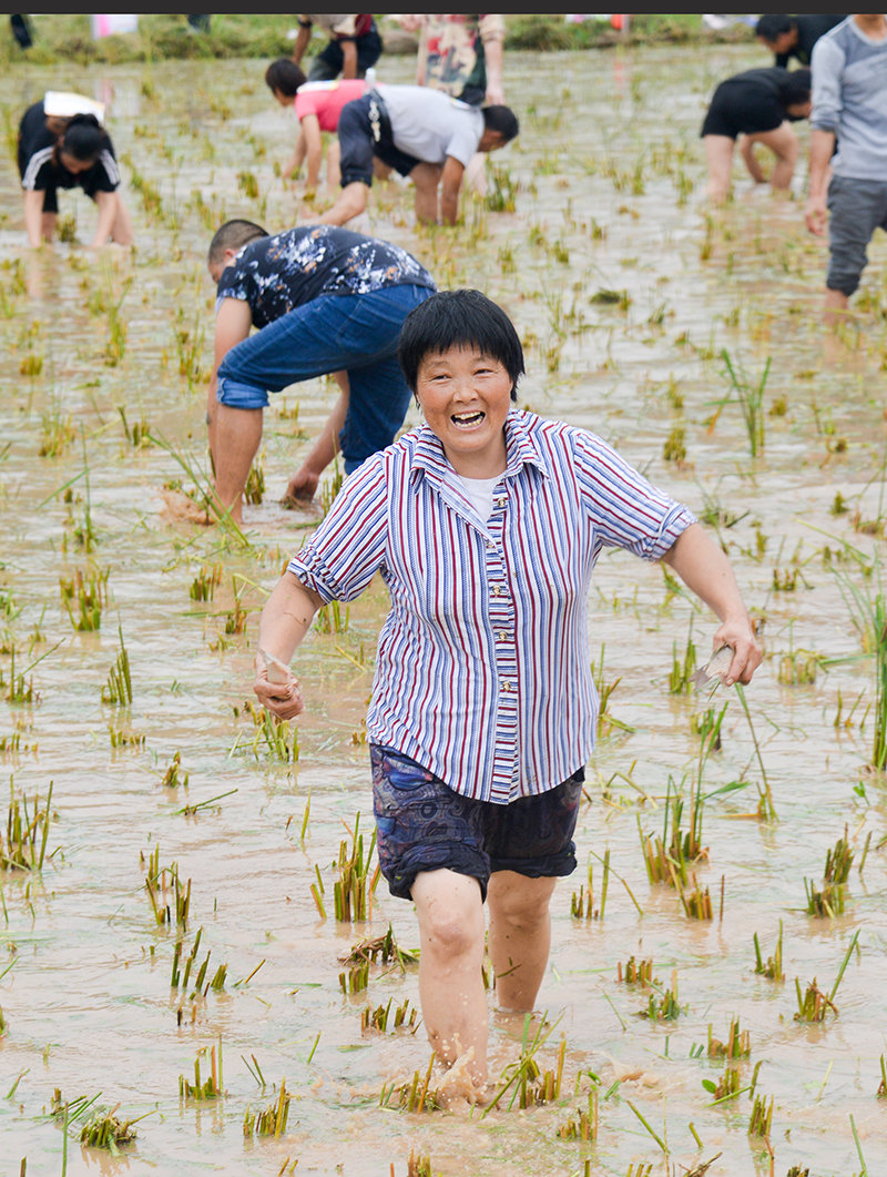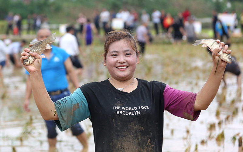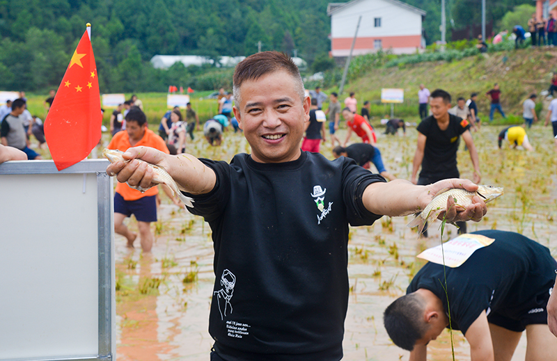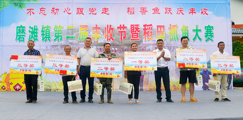 金浪滚滚、五谷飘香。9月11日,磨滩镇第二届农民丰收节暨“稻田抓鱼”比赛在百胜村举行,千余名村民、游客们齐聚在千亩稻田里徒手抓鱼、共庆丰收。