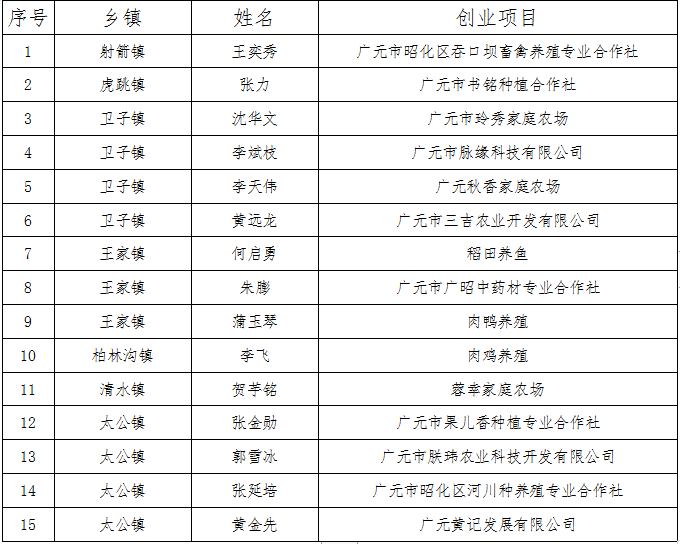 根据《广元市昭化区人力资源和社会保障局关于评选2019年度创业明星的通知》(昭人社发〔2019〕78号)要求,经乡镇初核推荐、就业局实地考察和部门联合评审,拟推荐以下15名人员为广元市昭化区“创业明星”: