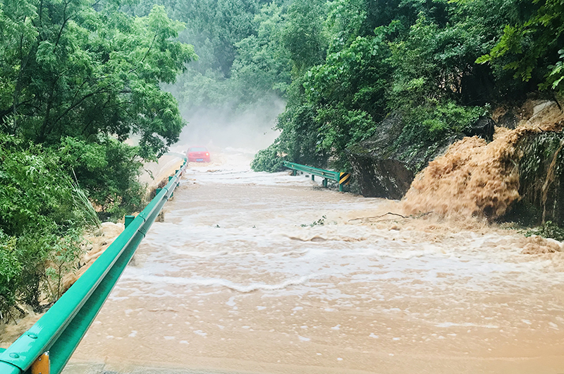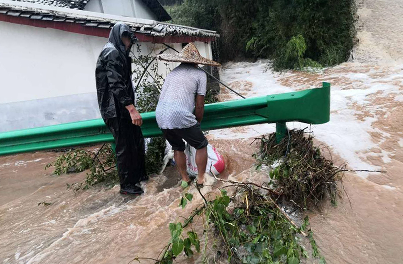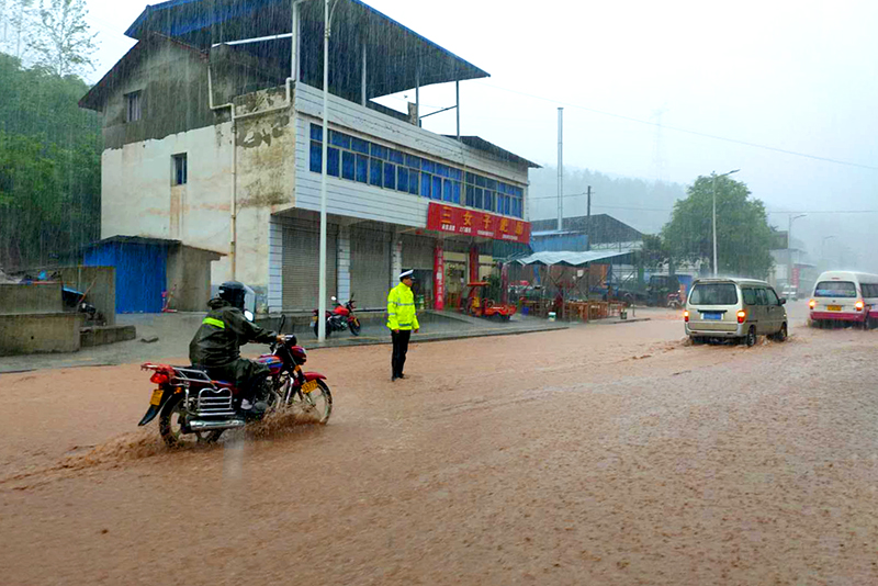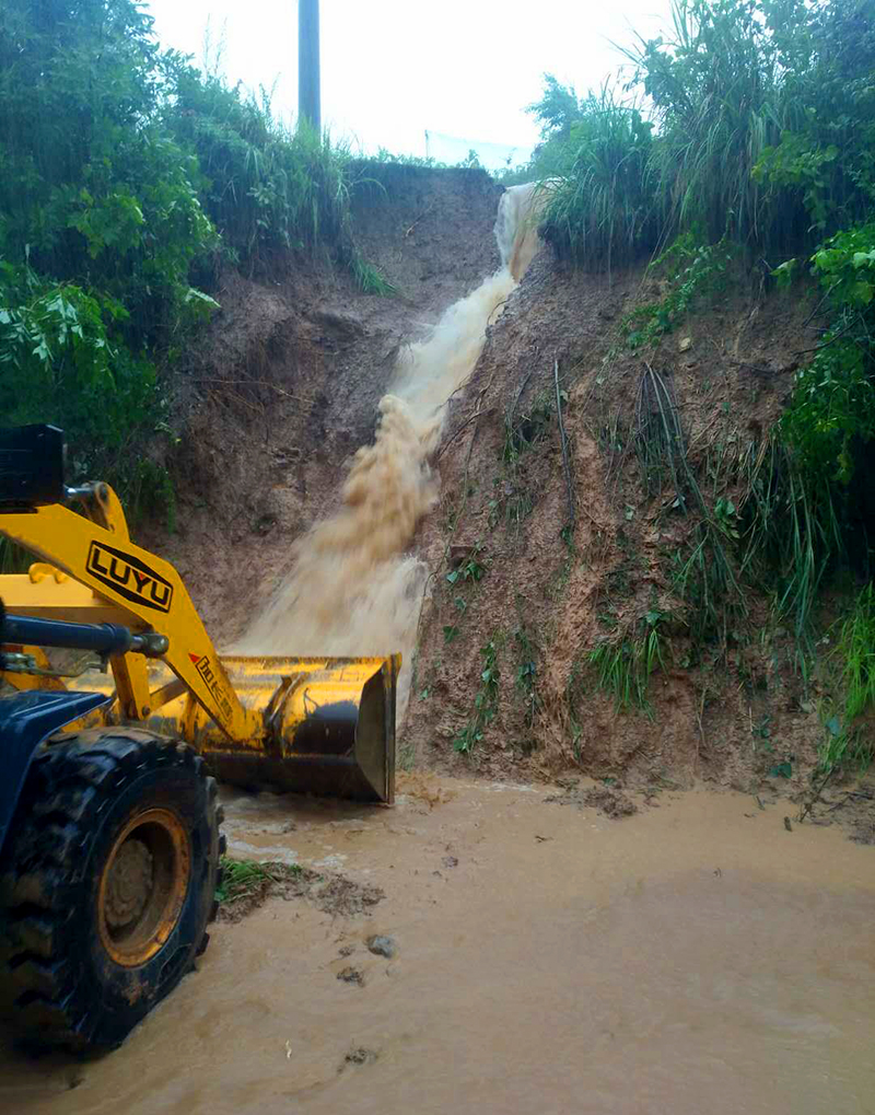 在石柏路石道角水库路段,由于水库泄洪能力有限,该水库的积水直接冲击到了道路中间,洪水漫过路面,导致此路段交通中断、行人通行受阻。目前,针对该道路受灾情况,当地村组干部正清理道路障碍,拉起警戒线,积极开展自救。