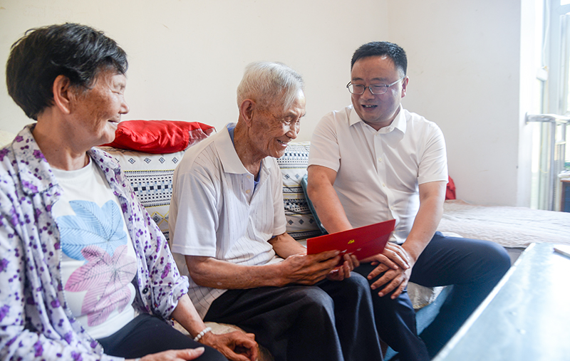 今年95岁的老党员刘发伦,参加过抗美援朝战争。来到刘老家,龙兆学紧紧握住他的手,与他促膝交谈,仔细了解老人的身体、生活情况,将党组织的关怀和温暖送到老党员心中。