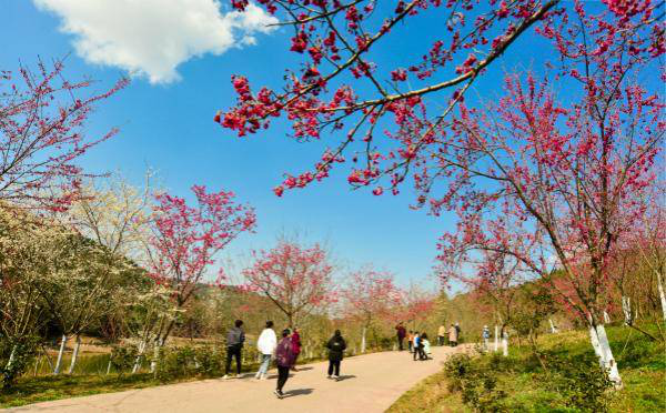 红如火、粉如霞、白如云……在近 5 公里长的樱花谷内,寒绯樱、山樱、霞樱等20余个品种的樱花如约绽放,一团团、一簇簇,挂满了枝头,妩媚多姿,游人置身其中,或观赏、或拍照,尽情感受着大自然的宁静与悠闲。