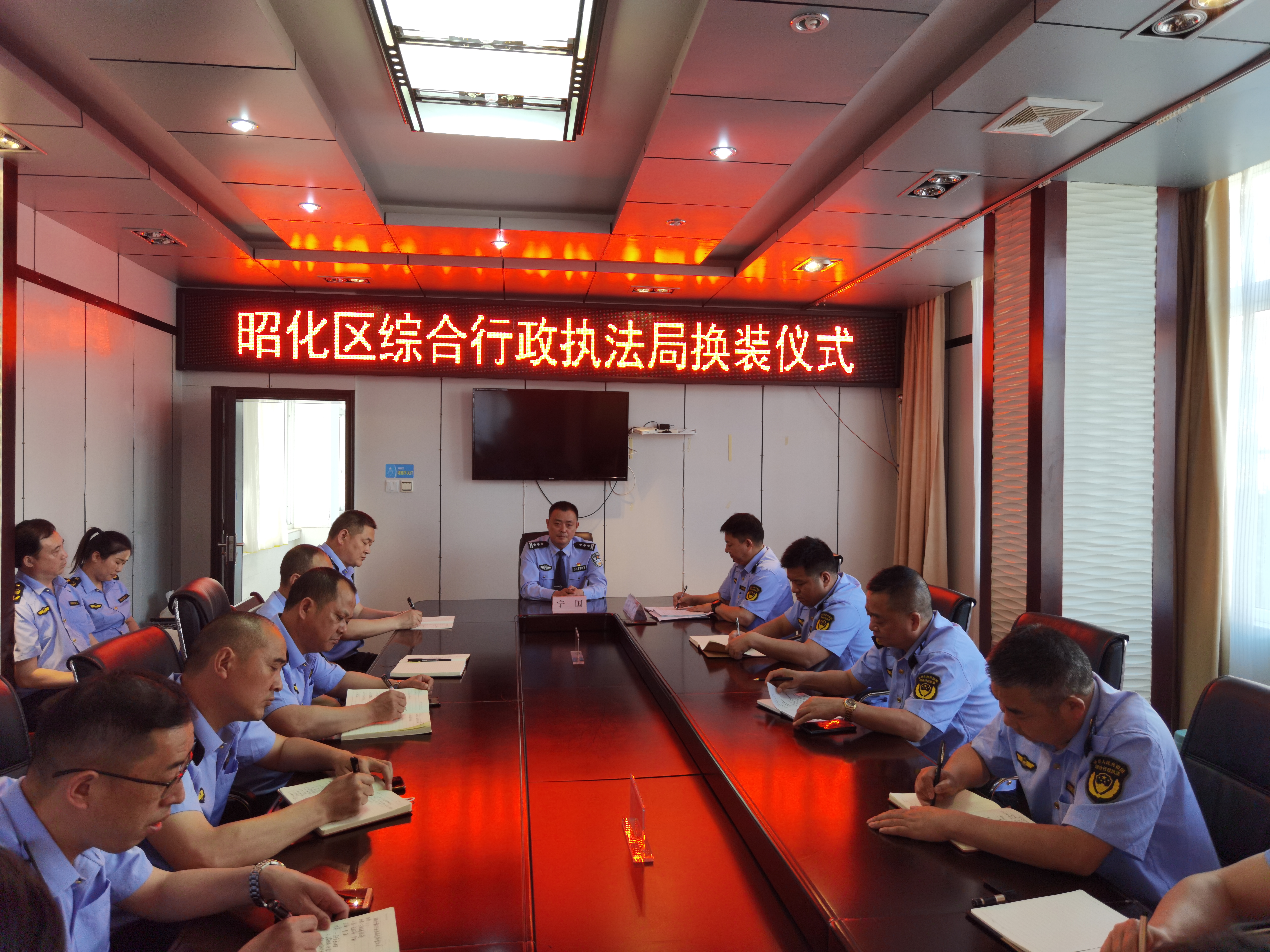为进一步推进规范执法、文明执法,建设一支管理精细化、执法规范化、服务人性化的综合执法队伍,2022年5月9日下午,广元市昭化区综合行政执法局在局二楼会议室举行行政执法制式服装换装仪式,全局干部职工身着统一新式执法制服参加会议,区人民政府副区长、区公安局局长宁国出席会议并讲话。
