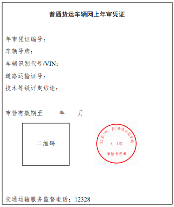 审验符合要求的,道路货物运输经营者可通过全国互联网道路运输便民政务服务系统下载《普通货运车辆网上年审凭证》(如下图)。
