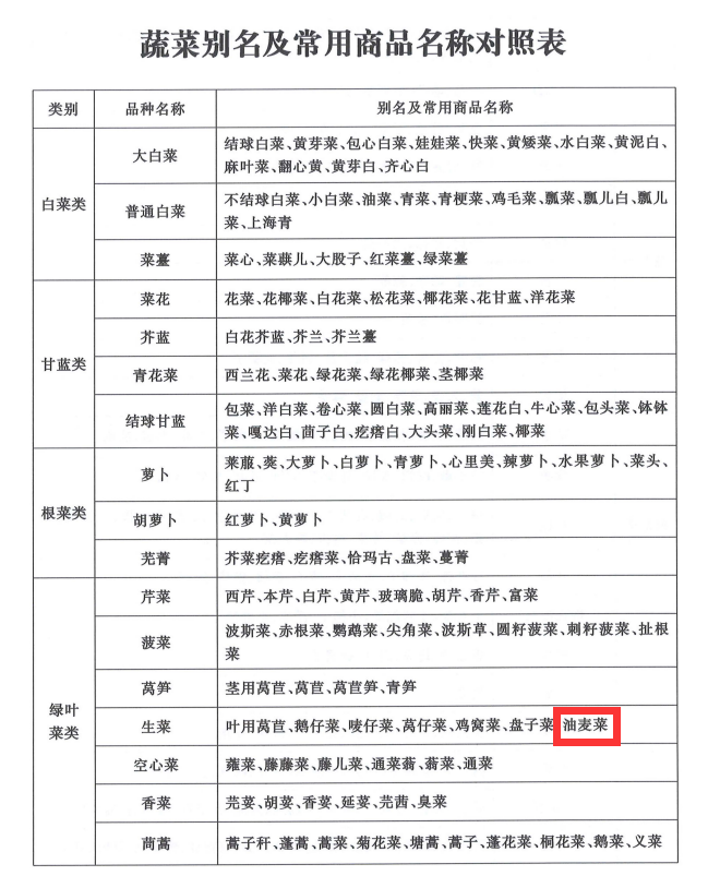 另外对《鲜活农产品品种目录》进行了调整和完善。比如油麦菜,在此新目录中,新增了蔬菜/水果别名及常用商品名称对照表,显示油麦菜属于生菜,而生菜属于绿叶菜类,在品种目录内,应享受“绿色通道”政策。