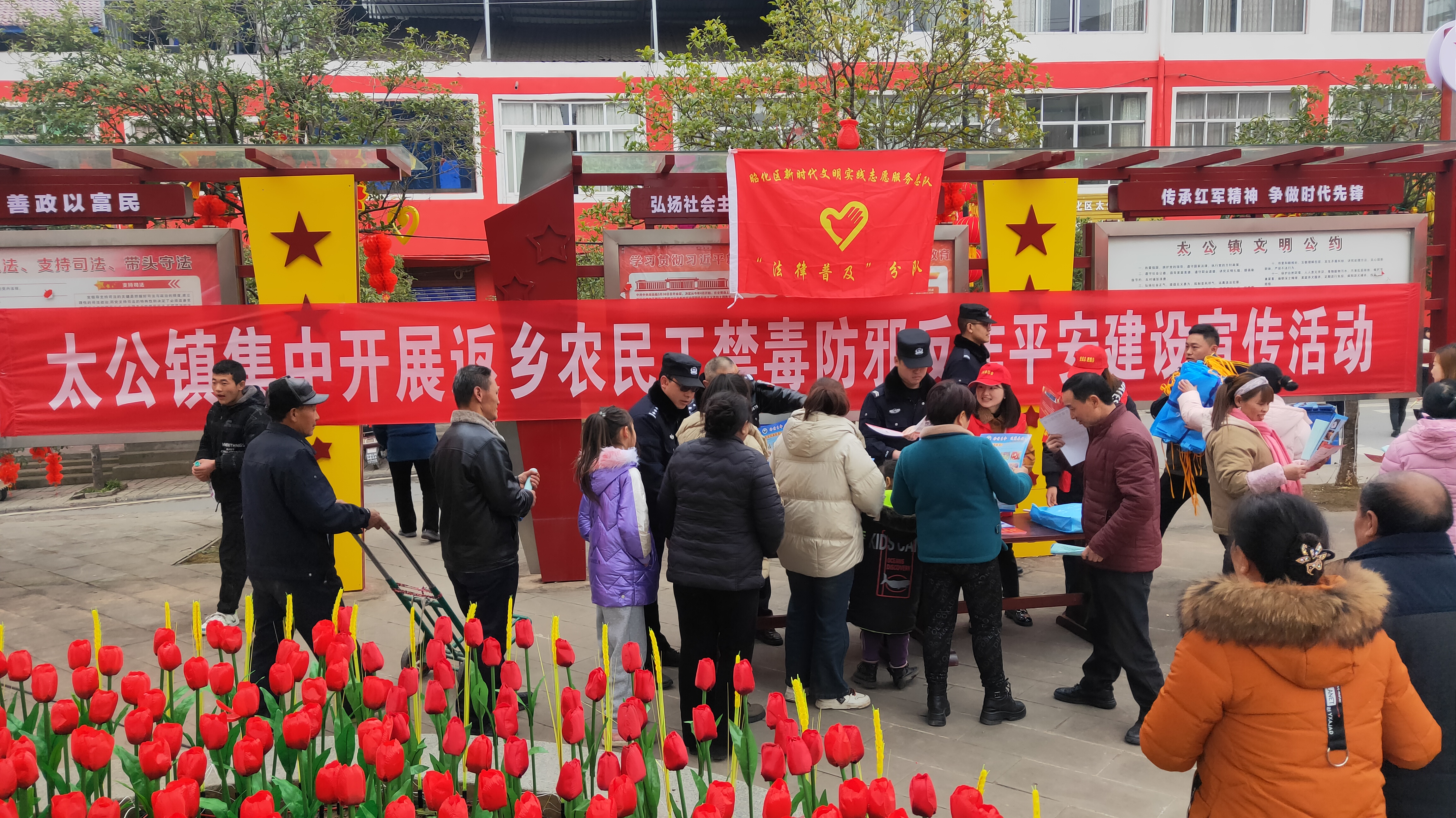 年关将至,为增强人民群众的法治意识,确保人民群众的切身利益,筑牢人民群众的安全思想防线,太公镇于1月30日下午,结合迎新春文艺演出开展了禁毒防邪反诈等系列宣传活动。