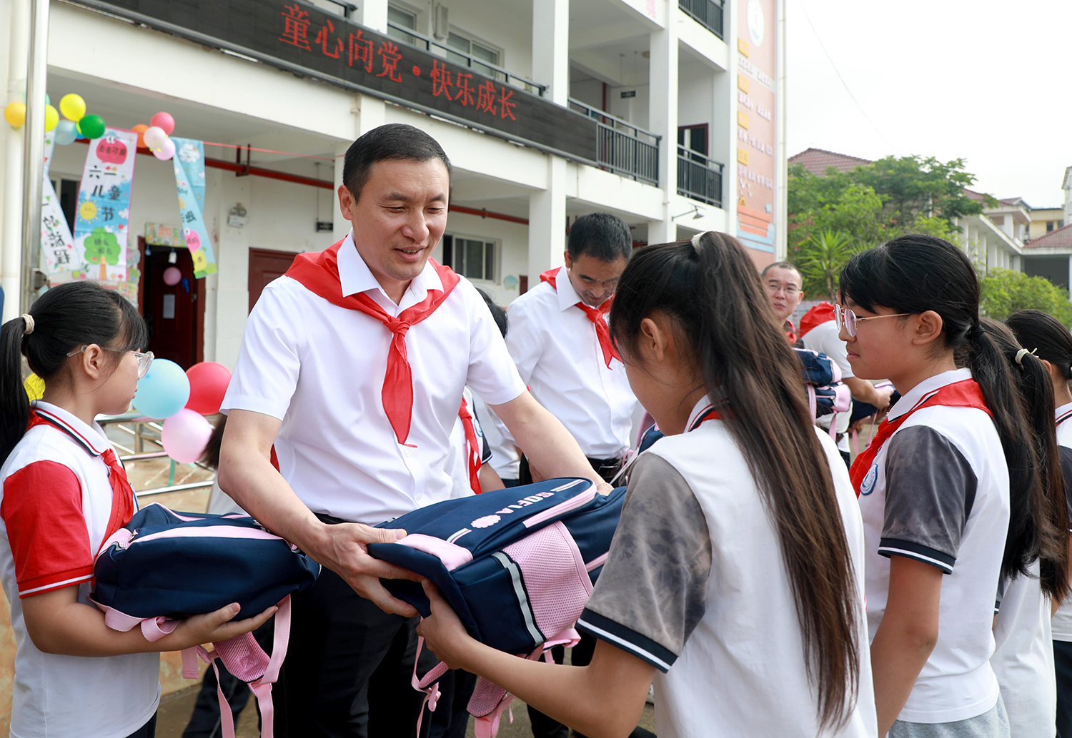 在虎跳镇小学,辛俊一行戴上少先队员献上的红领巾观看少先队新队员入队仪式,并为同学们送上节日礼物,辛俊祝福同学们节日快乐、茁壮成长,勉励他们珍惜时光、不负韶华,坚持德智体美劳全面发展,争做爱党爱国、自立自强、奋发向上的新时代好少年。