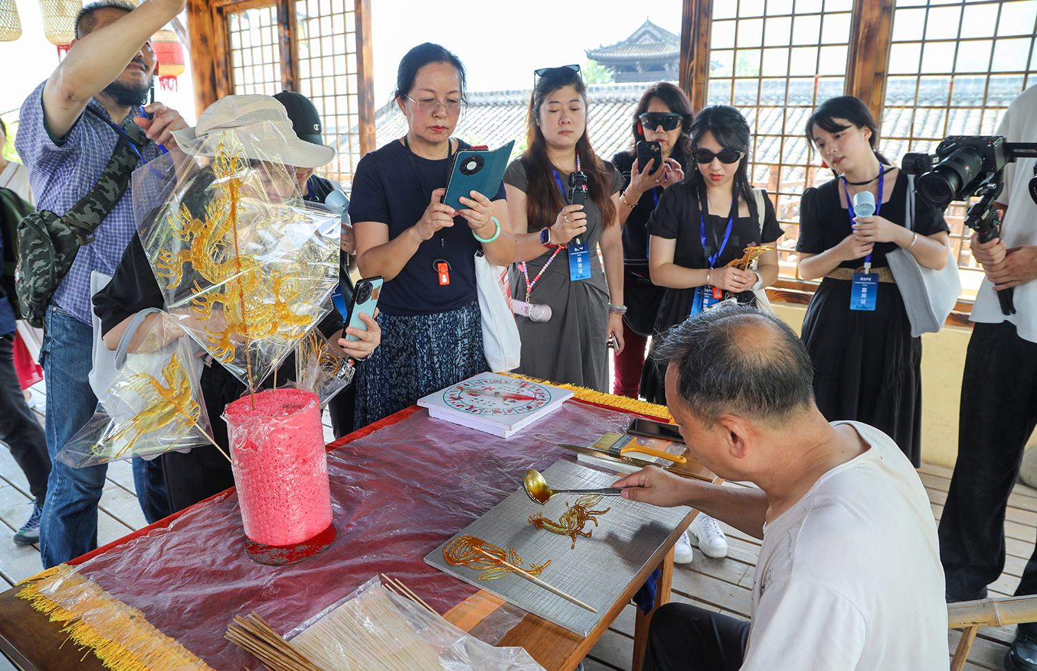 当天,广元市级非物质文化遗产薛氏糖画传承人和广元市级非物质文化遗产陈氏彩绘彩塑传承人现身昭化古城,通过沉浸式互动体验的方式,为海外华文媒体代表呈上了一场文化盛宴。