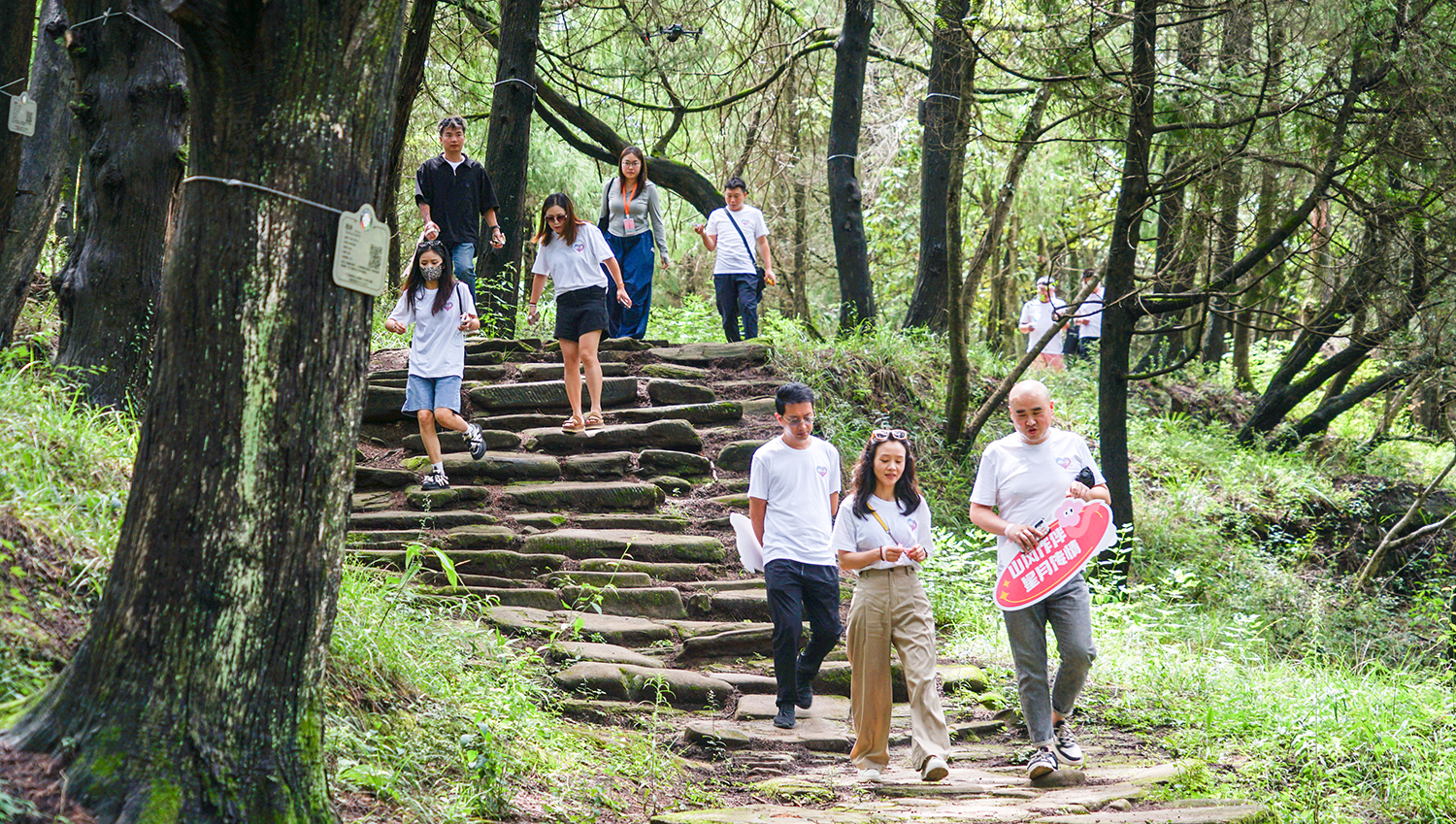 夏末秋初,雨后的蜀道呈现出别样的韵味。连绵不绝的古柏林遮天蔽日,阵阵清风拂过,古柏树叶沙沙作响,宛如人间仙境。嘉宾们行走在青石板路上,不时驻足端详古柏饱经沧桑的粗壮树干。有的人用手机记录蜀道沿途的美景,有的人正忙着与新结识的朋友交流所见所闻,有的人正认真聆听蜀道的千年故事……动静之间,蜀道上浸润着愉快浪漫的氛围。