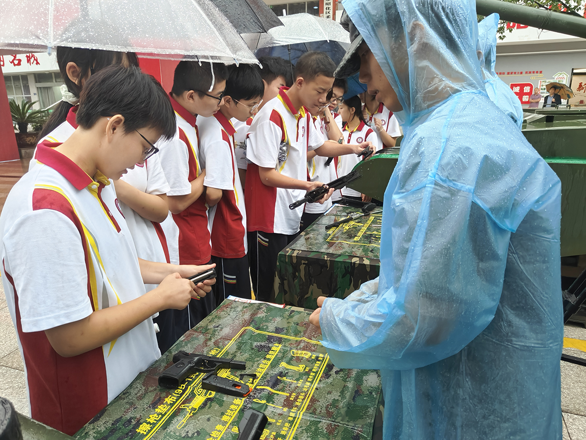 安全检查、弹匣取出、枪机拆卸……同时,在场馆旁边的国防科普设备展上,讲解员正有条不紊地演示机枪拆卸步骤,并围绕迫击炮、99A式主战坦克、122装甲车等各类国防设备,向同学们细致讲解其性能特点与作战用途,为同学们打造了一场沉浸式国防设备科普体验,让大家在近距离接触中直观感受国防装备的魅力。