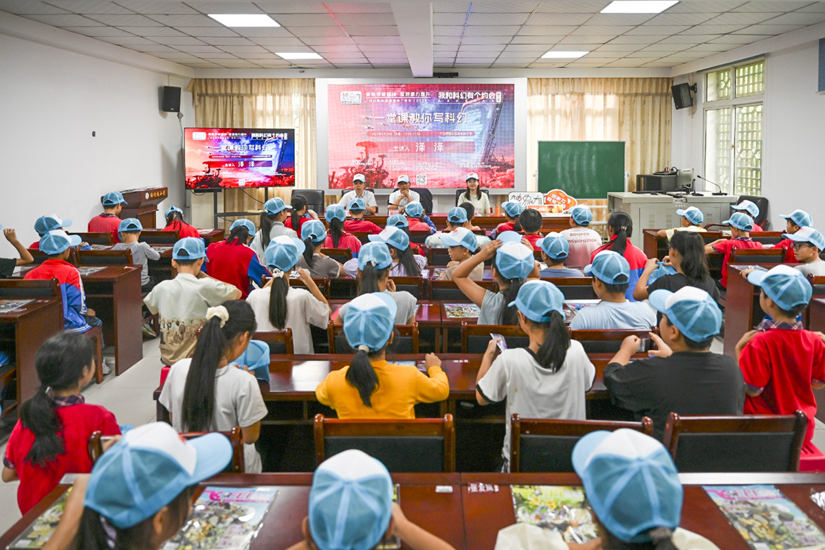 与此同时,学校礼堂内,省科学技术协会“科幻融合发展扶持”计划——“我和科幻有个约会”主题活动,以“育科学家精神,促想象力提升”为核心,为小学生们带来一堂充满趣味的科幻创作启蒙课。科幻世界想象力课程编辑、四川省作家协会会员、四川科普作家协会会员泽泽老师以生动、直观的故事,结合经典科幻作品与前沿科技,引导学生突破思维边界。通过“生活化引导-逻辑化建构-创意化表达”三阶教学法,系统拆解科幻创作核心要素。并开展互动提问启发学生,现场学生踊跃发言,提出充满想象力的设想。
