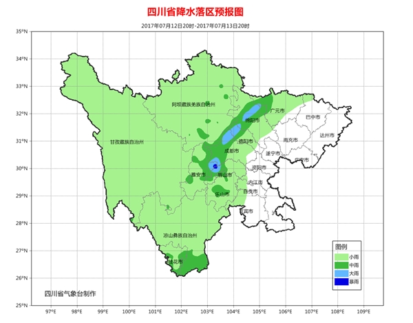 另据省气象台预测:13日傍晚-15日,盆地自西向东有一次雷雨天气过程,雨量普遍中雨,部分地方大雨到暴雨,局部大暴雨;攀西地区有小到中雨,局地大雨到暴雨。
