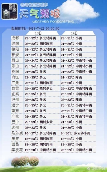 根据成都市气象台预计,12日晚到13日白天成都云层试图遮盖阳光,分散性阵雨或雷雨光临,雷雨时伴有短时阵性大风,最高气温34℃,13日晚到14日白天阴云天有阵雨或雷雨驻足,雨量升级为中雨,东南部局部大雨,最高气温下降至30℃。14到15日将有中到大雨,高温天气逐渐缓解。
