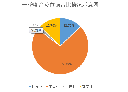 (二)零售业主导整个消费市场。一季度批发业零售额实现0.7亿元,同比下降10.9%,占社消零总额的12.7%;零售业零售额实现4亿元,同比下降10%,占社消零总额的72.7%;住宿业零售额实现0.1亿元,同比下降24.8%,占社消零总额的1.9%;餐饮业零售额实现0.7亿元,同比下降17.3%,占社消零总额的12.7%。从占比来看,零售业零售额依然占据我区整个消费市场的主导地位。(见下图)