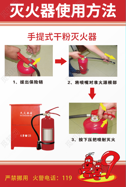手提式灭火器是指能在其内部压力作用下,将所装的灭火剂喷出以扑救火灾,并可手提移动的灭火器具,主要由筒体、器头、喷射软管(喷嘴)及灭火剂等组成。