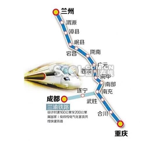 兰渝铁路与现有的渝黔铁路相连接,是西宁(兰州)到成都(重庆)至广州的南北铁路大干线,与京广线、京沪线并列为三条南北铁路大动脉之一,为西部地区连接珠三角、长三角地区的重要通道。线路设计时速160公里-250公里,属国铁Ⅰ级双线电气化客货共线快速铁路,沿线主要城市有兰州、陇南、广元、南充、重庆。目前,兰渝铁路重庆至四川广元段已经通车。从岷县到兰州段,只待胡麻岭、木寨岭隧道完工,即可实现全线通车。
