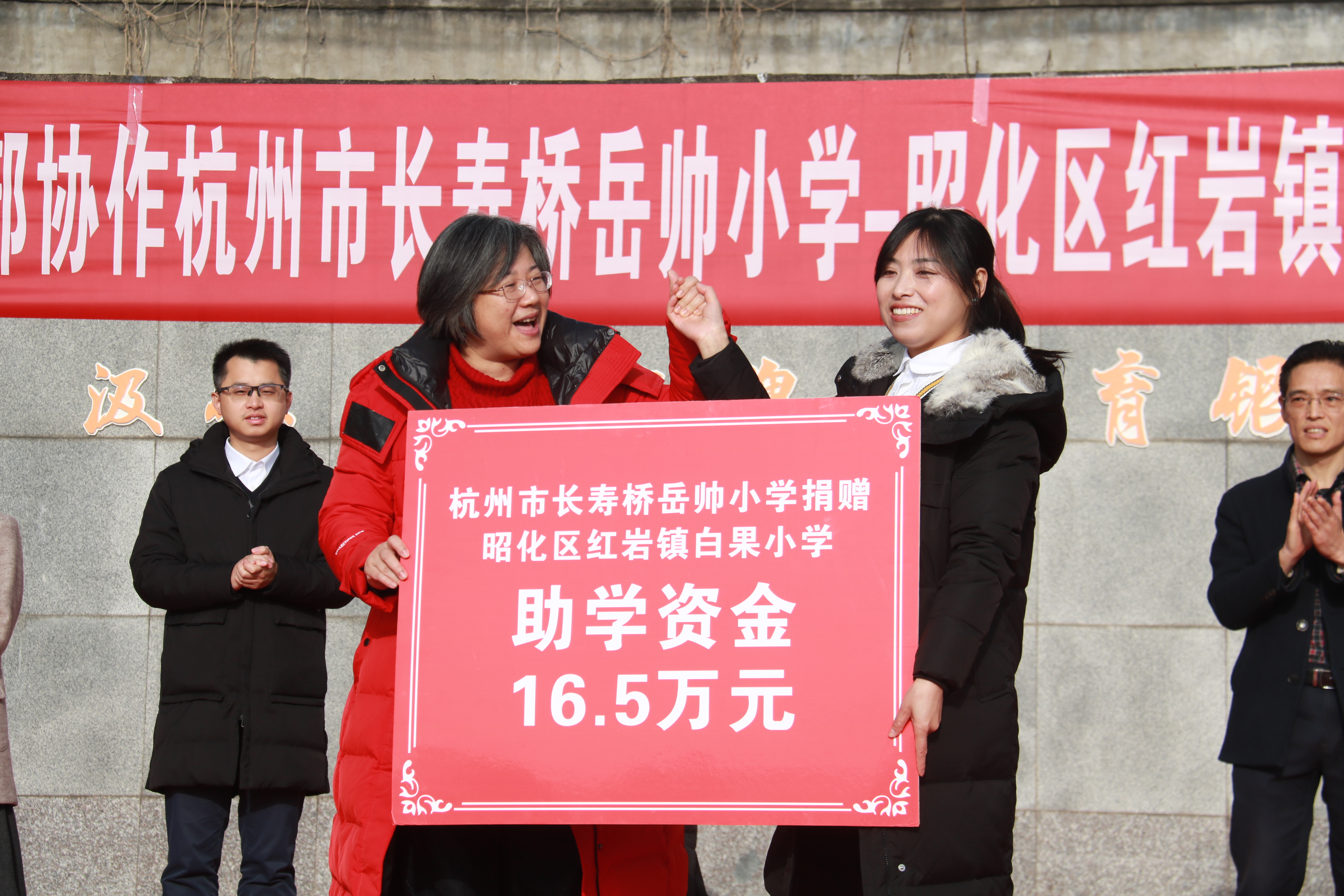 12月17日,杭州市长寿桥岳帅小学与广元市昭化区白果小学结对签约暨助学捐赠仪式在白果小学举行。杭州市长寿桥教育集团党委书记金颖,昭化区政府办公室副主任潘亚璐,昭化区教育局党组书记、局长龚贵宏,昭化区红岩镇党委副书记、镇长陈月出席。