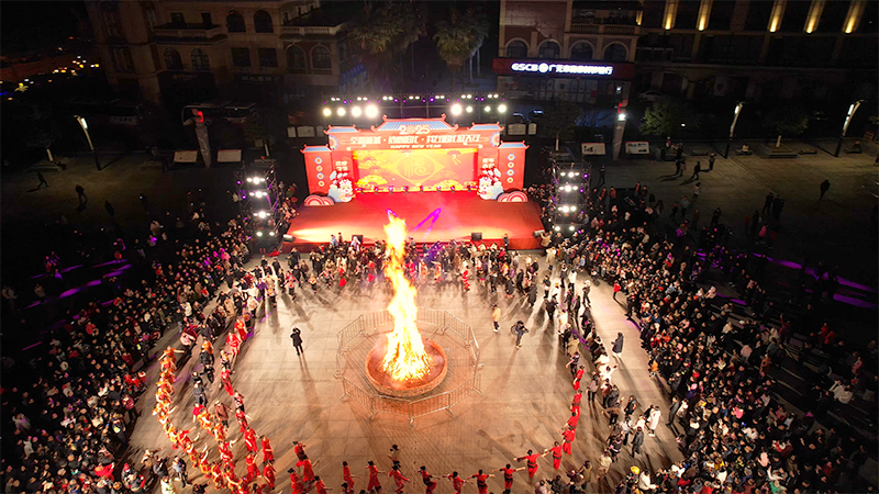 随着熊熊篝火被点燃,火焰腾空而起,照亮了夜空。开场舞《巳巳如意春来到》热闹开场,拉开晚会帷幕。