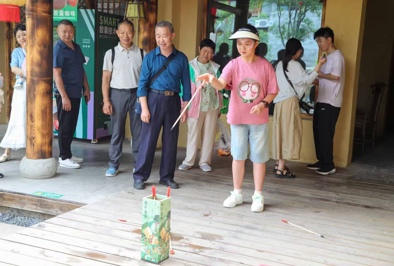除了包粽子、射五毒民俗体验,在汉寿庭苑的投壶活动也吸引了大量游客驻足。大家手持10支箭,向目标投去,游客们纷纷展示自己的投箭技巧,交流心得,现场加油声、喝彩声此起彼伏。