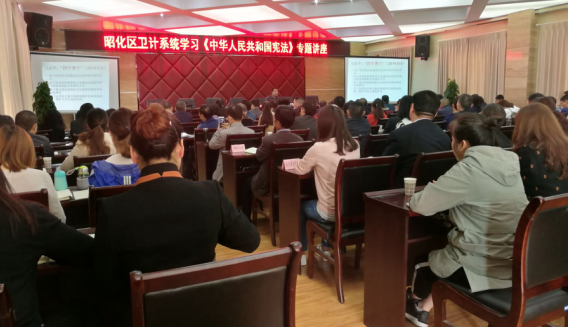 2018年4月27日,按照2018年昭化区卫计系统推进法治政府建设、依法治区和会前学法的年度计划和安排,组织局机关干部、区属各医疗卫生机构和乡镇(中心)卫生院主要负责人、分管院长、支部书记等160余人,在区卫计局四楼会议室集中学习新宪法。