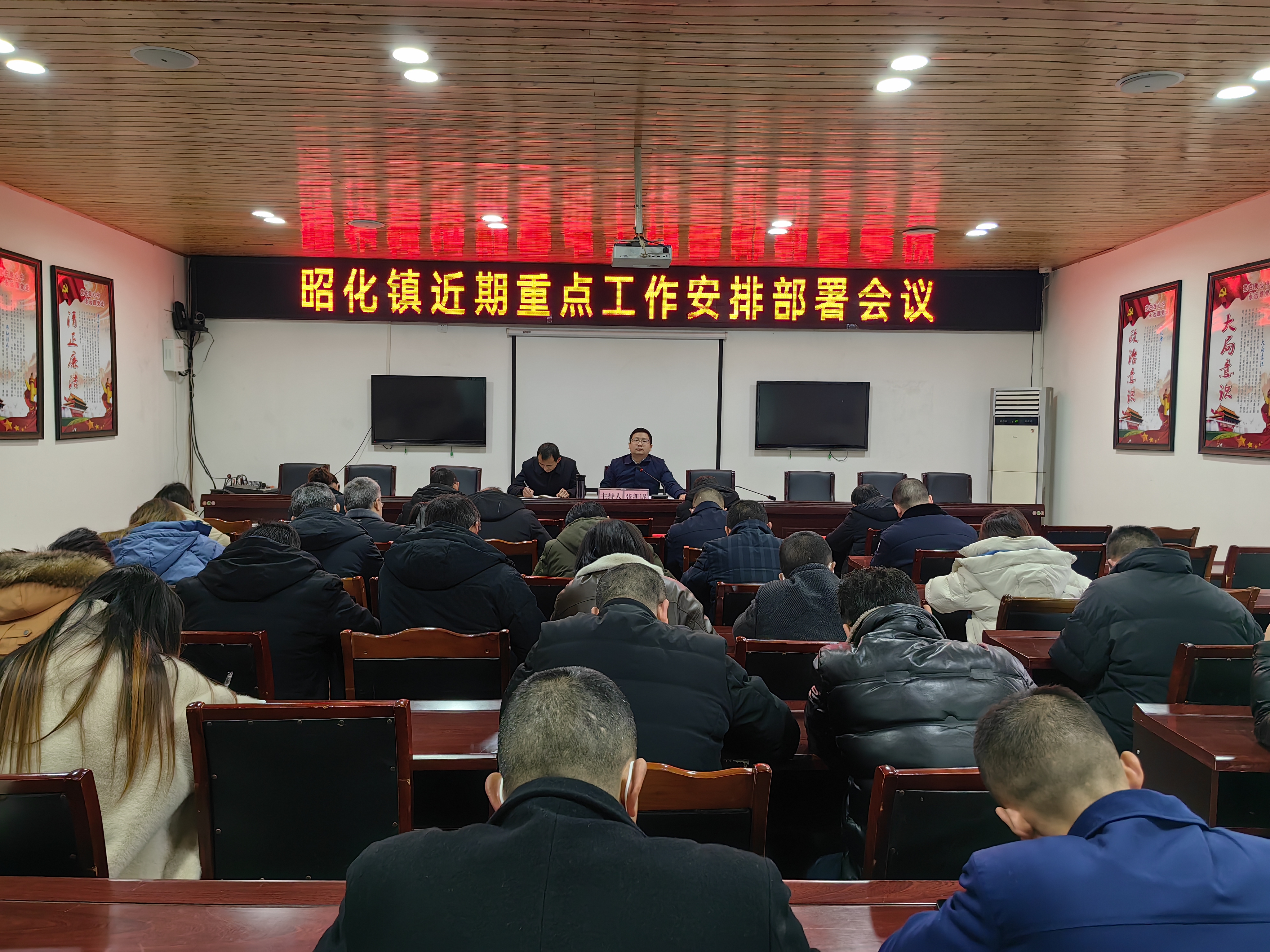 为深入学习贯彻区委八届三次全会精神,切实把思想和行动统一到全会精神上来,1月11日上午10时,昭化镇召开近期重点工作安排部署会议,细化落实措施。会议由党委书记张凯铌同志主持,全体班子成员、各村(社区)支部书记、各部门(站所)负责人及区级驻镇单位负责人等50余人参加会议。
